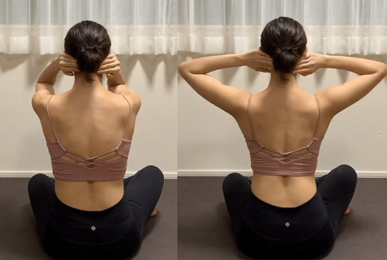 Đặt hai tay phía sau gáy, tay gập thành hình chữ V rồi mở rộng cánh tay từ phía trước mặt ra phía ngang vai. Hãy mở rộng cánh tay ra sau để cảm thấy 2 bả vai gần chạm vào nhau.
