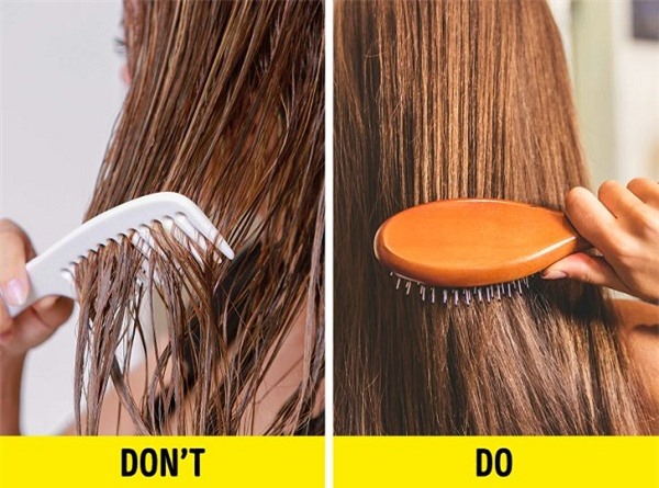 Tóc ướt là trạng thái yếu ớt nhất. Chải tóc hay lau khô mạnh tay bằng khăn cũng có thể khiến tóc bị hư tổn. Cách tốt nhất là dùng khăn thấm tóc ướt nhẹ nhàng và để tóc khô tự nhiên.
