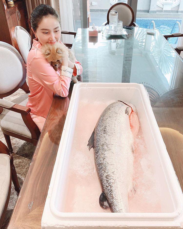 Biết Bảo Thy quyết tâm mạnh mẽ giảm cân như vậy, ông xã nhà người ta đã cất công “vớt” cho bà xã nguyên con cá hồi Na Uy nặng 7kg lận để cô nàng ăn dần cho khoẻ, đẹp mà không béo.