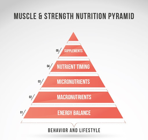 Theo Thế Anh, tầng dưới cùng và cũng là yếu tố quan trọng nhất là calories – tổng năng lượng cơ thể nạp vào. Với trường hợp giảm cân, giảm mỡ, tổng năng lượng từ thức ăn trong một ngày phải ít hơn lượng cơ thể tiêu thụ cho các hoạt động trao đổi chất cơ bản, vận động hàng ngay và tiêu hóa thức ăn.