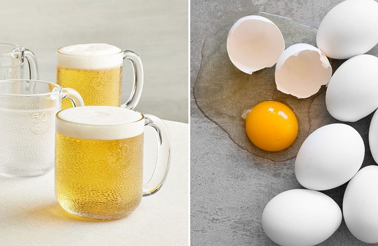 Bên cạnh những lợi ích mà bia đem lại, trứng gà còn cung cấp cho làn da nhiều dưỡng chất như vitamin nhóm B, protein và axit amin. Các dưỡng chất từ trứng gà có tác dụng dưỡng trắng da, se khít lỗ chân lông, làm mờ đốm sạm nám và các nếp nhăn trên da mặt.