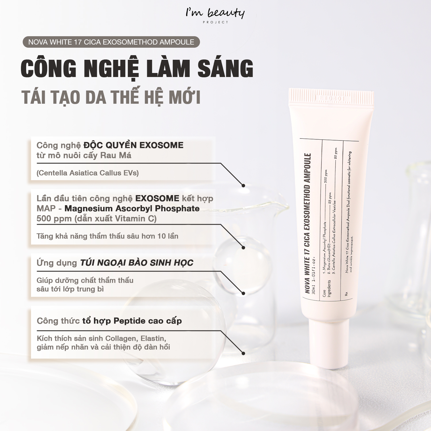 Trong khi nhiều sản phẩm chống lão hóa trên thị trường chỉ tập trung vào làm đầy bề mặt nếp nhăn, NOVA WHITE 17 CICA EXOSOMETHOD lại đi theo hướng kích hoạt khả năng tự tái sinh của tế bào, nuôi dưỡng làn da từ bên trong. Cùng với các thành phần ưu việt như Magnesium Ascorbyl Phosphate 500 ppm (dẫn xuất Vitamin C ổn định), Niacinamide 2%, và Panthenol, sản phẩm mang lại hiệu quả toàn diện: làm sáng, phục hồi và chống lão hóa và tất cả đều sẵn sàng trong một tuýp ampoule tinh gọn.