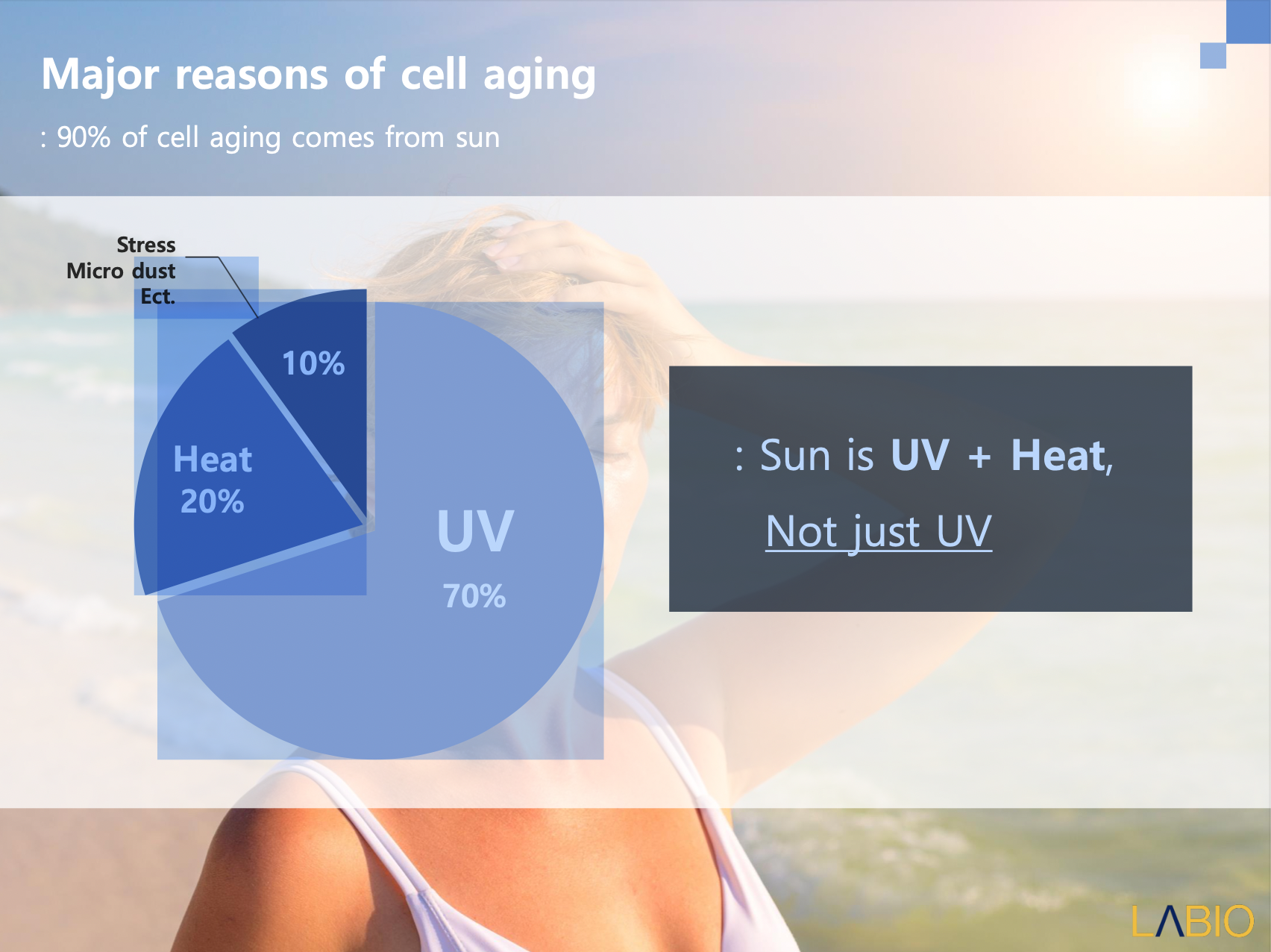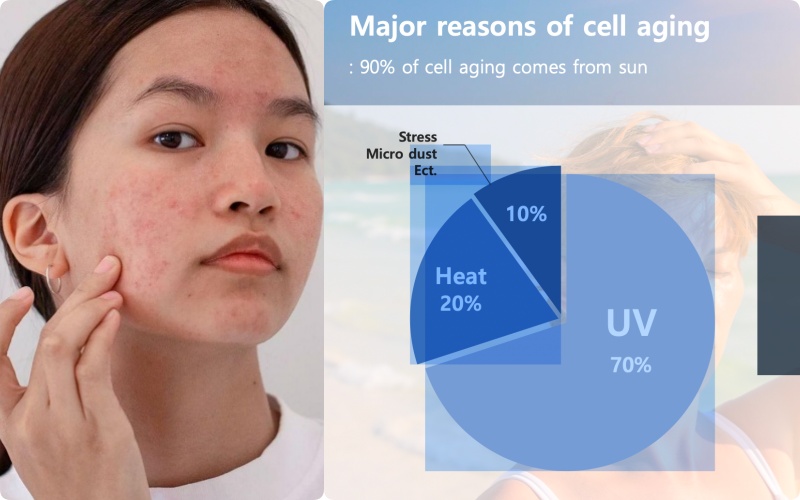 Theo nhiều nghiên cứu cho thấy, ánh nắng mặt trời không chỉ có tia UV mà còn có nhiệt độ tác động lên da. Nếu như tia UV gây lão hóa da 70% thì nhiệt độ khi tác động lên da cũng gây nên tình trạng lão hóa do nhiệt, chiếm 20%. Còn lại là bụi mịn, ô nhiễm môi trường.