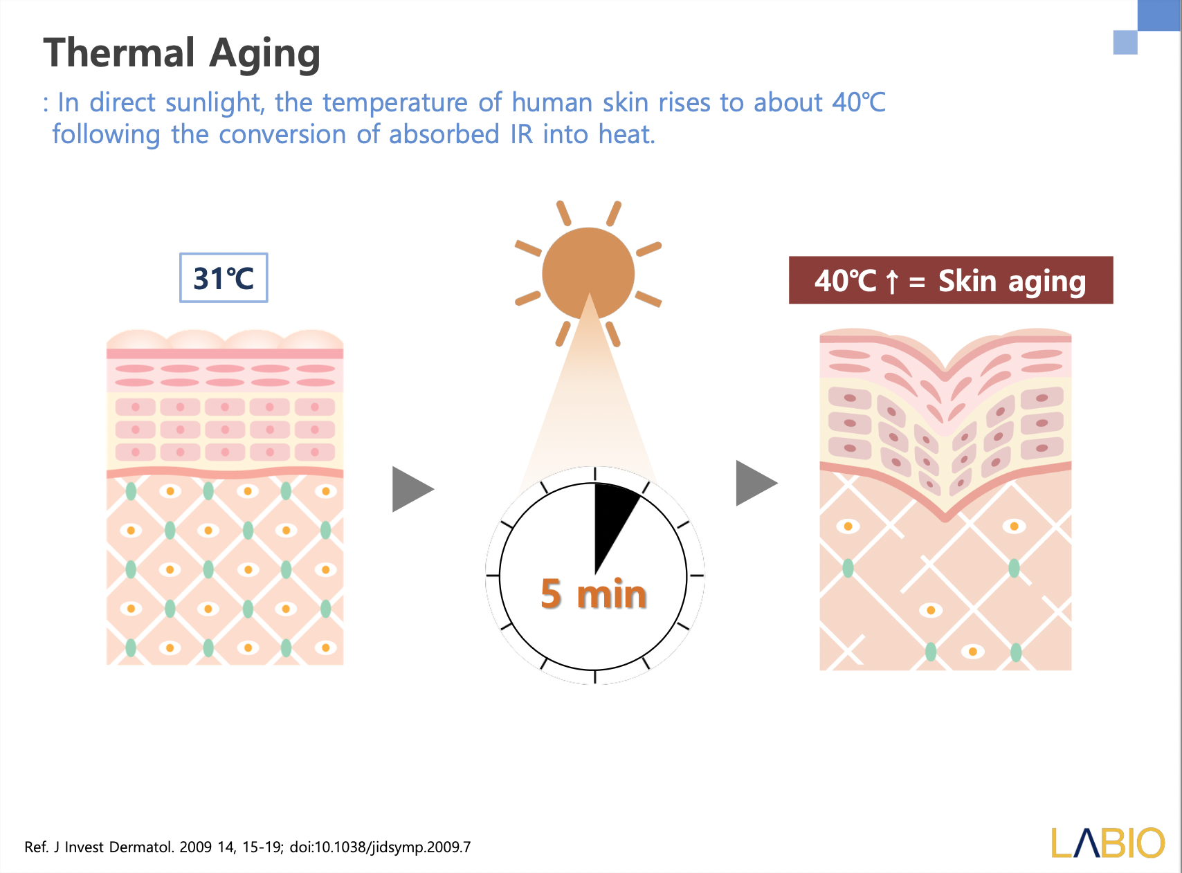 Khi tiếp xúc với ánh nắng mặt trời, nhiệt độ trên da tăng 40 độ C do chuyển hóa hồng ngoại thành nhiệt, và chỉ sau 5 phút, làn da đã in hằn rõ dấu hiệu lão hóa.
