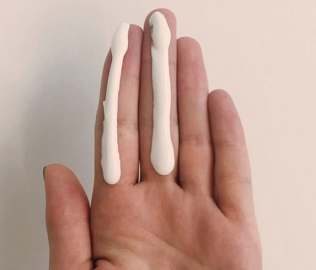 – Lấy khoảng 0.8g (tương đương lượng kem bằng 3 đốt ngón tay) và thoa đều khắp mặt.