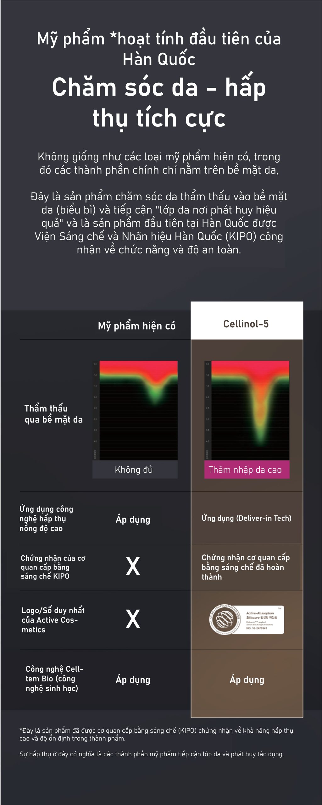 Công nghệ được cấp bằng sáng chế giúp tăng cường khả năng hấp thụ các thành phần hiệu quả để tăng độ đàn hồi cho các nếp nhăn sâu. Hoạt chất cao Resveratrol giúp chống oxy hóa, ức chế sản sinh melanin. Đồng thời Ectoin dưỡng ẩm lâu dài, ngăn ngừa sự bốc hơi ẩm. Niacinamide Làm trắng, chăm sóc vấn đề da.