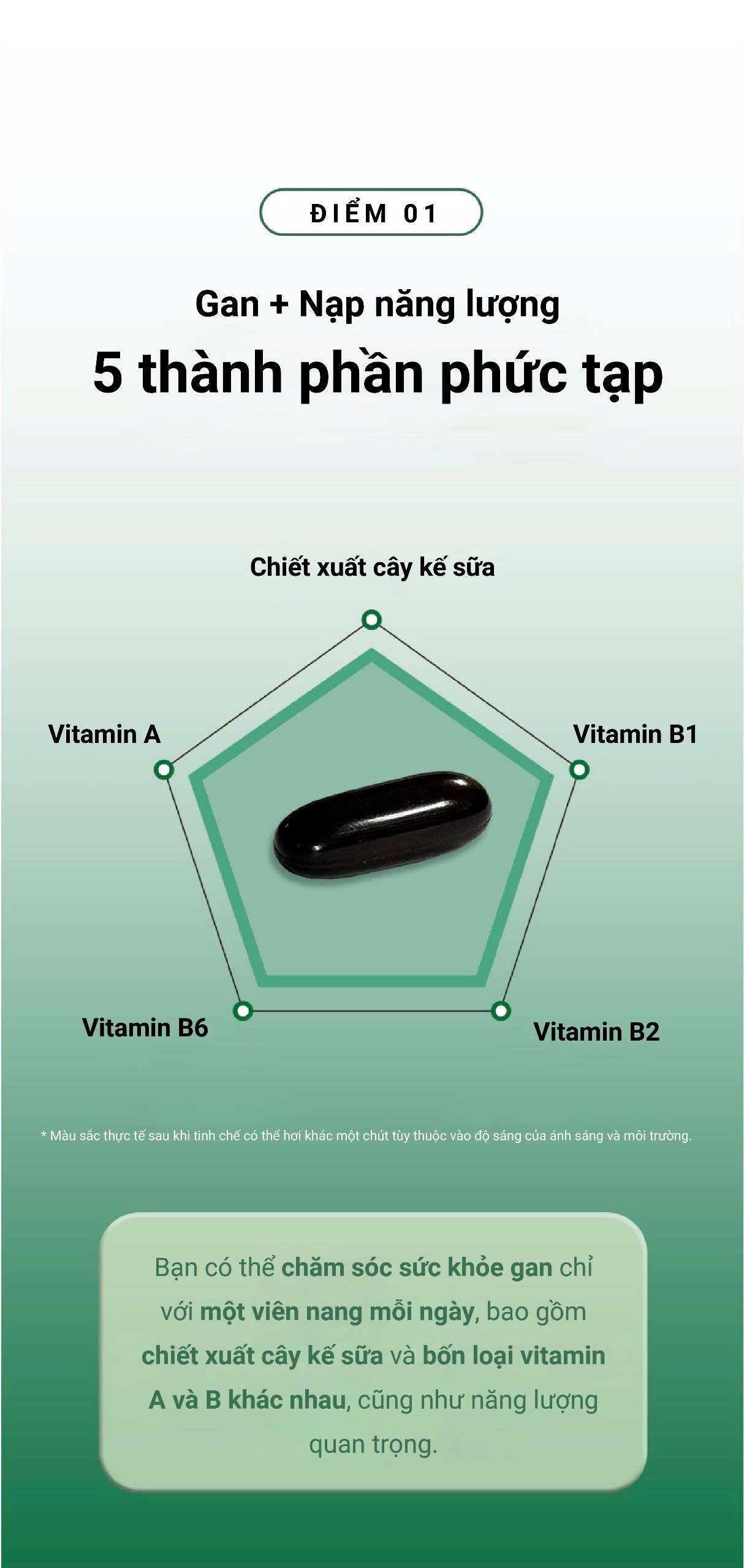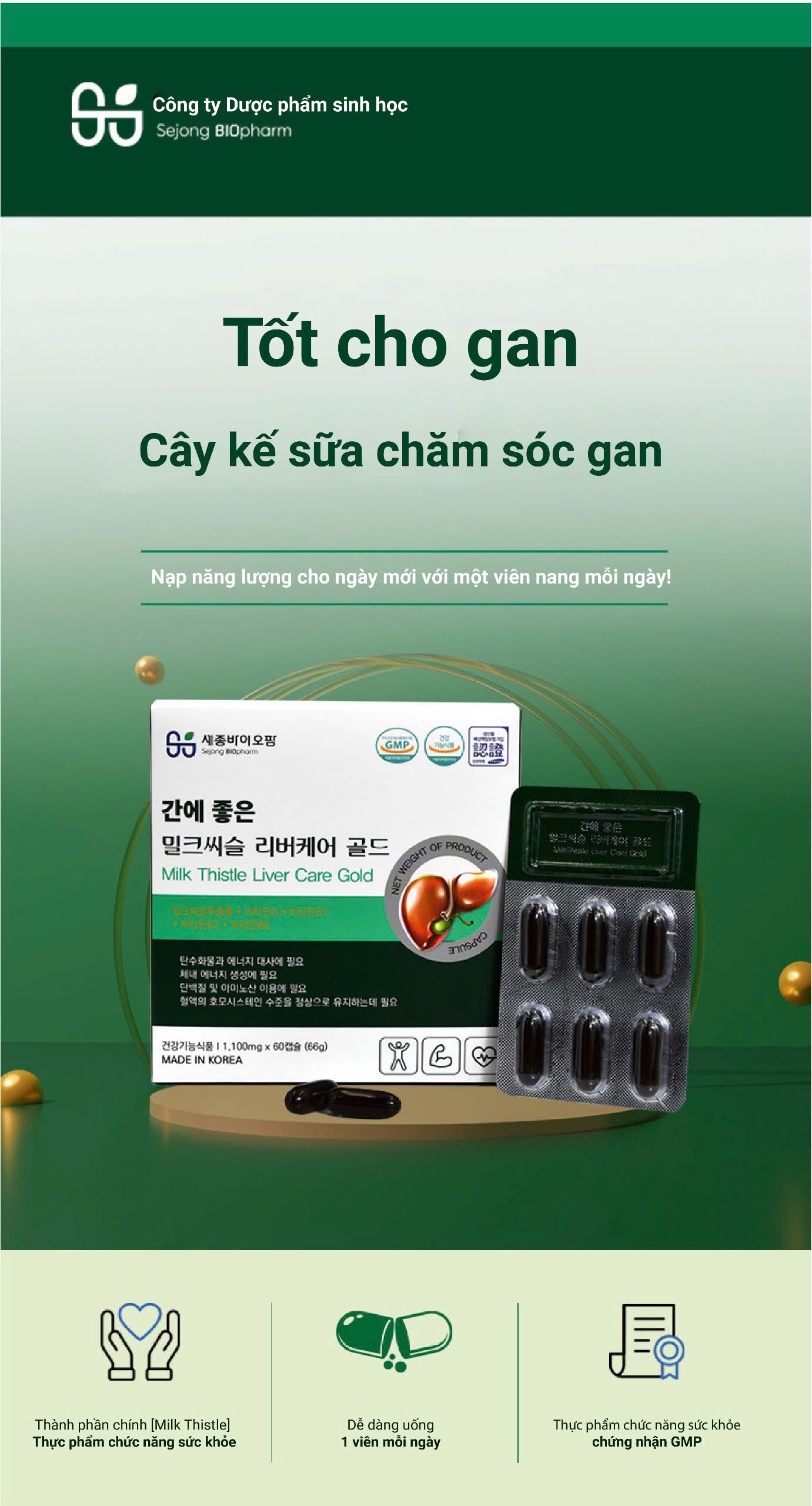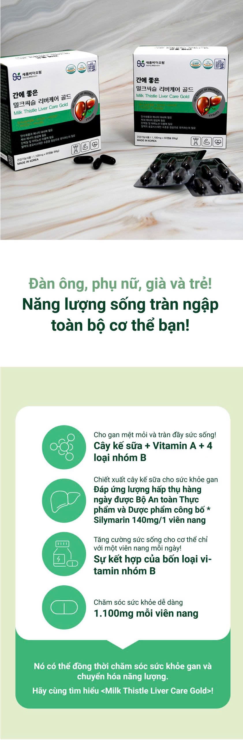 Chiết xuất cây kế sữa cùng 5 thành phần tốt cho gan và những ngừoi có vấn đề về gan cũng như giúp cơ thể tràn nhập năng lượng sống. Chỉ với 1 viên nang 1 ngày bạn có thể chăm sóc các vấn đề về sức khoẻ gan