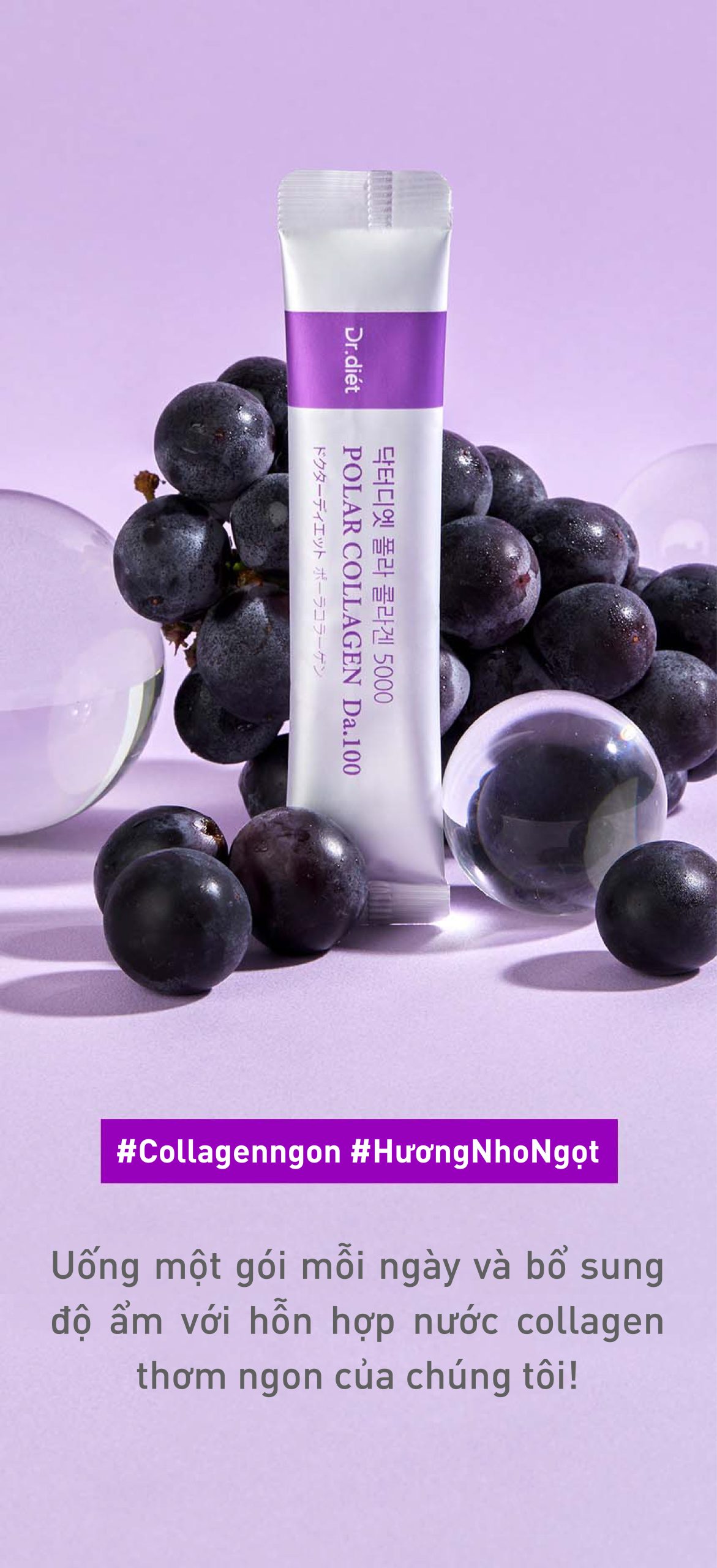 Collagen cá phân tử thấp (từ Ấn Độ), bột nước ép nho (từ Chile), axit citric, glucose tinh thể dạng bột, vitamin C, chlorella (từ Đài Loan), axit DL-malic, natri bicarbonate, hương nho, axit hyaluronic, sucralose, bột khoai lang tím, sắc tố dành dành, vitamin A