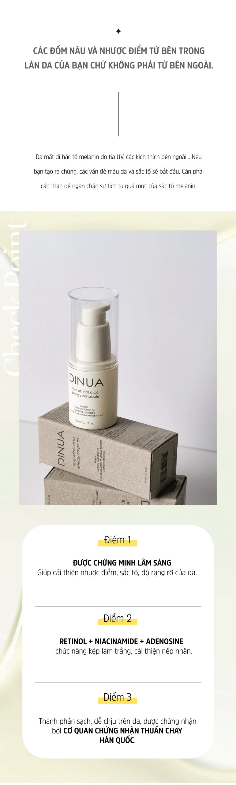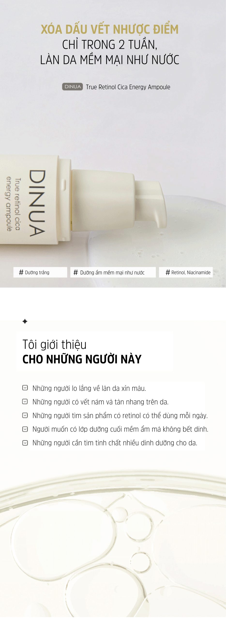 Dinua True Retinol Cica Energy Ampoule xóa dấu vết nhược điểm chỉ trong 2 tuần cho bạn làn da mềm mại như nước.