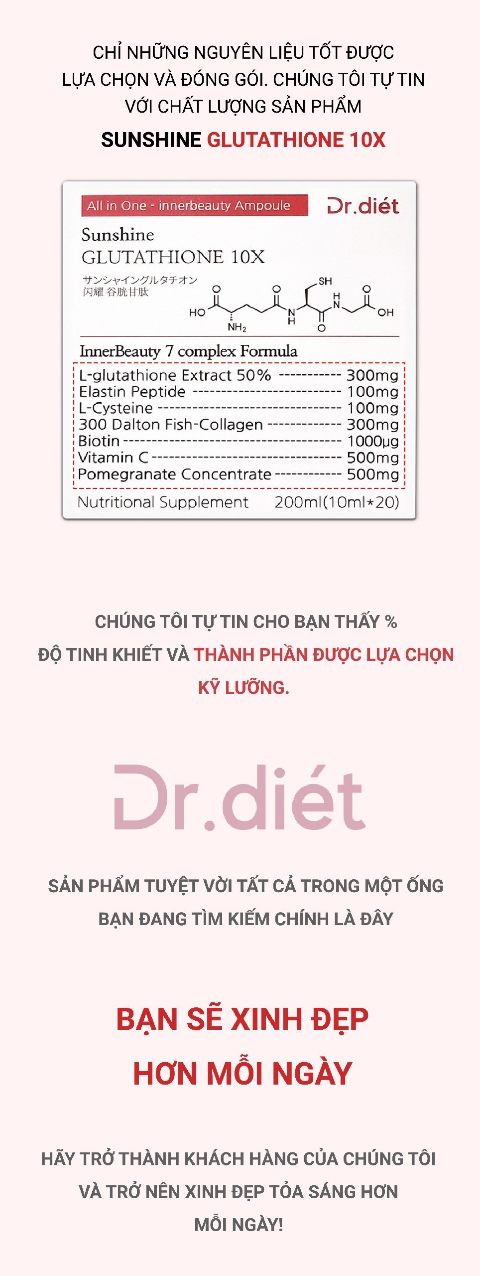 Dr Diet Sunshine Glutathion 10X với 7 nguyên liệu làm đẹp được tổng hợp trong 1 ống làm đẹp, hàm lượng vượt trội và độ tinh khiết. Bao bì đổi mới giúp sử dụng tiện lợi, bảo quản chất lượng. ÁNH SÁNG MẶT TRỜI : Năng lượng trắng trỗi dậy từ bên trong.