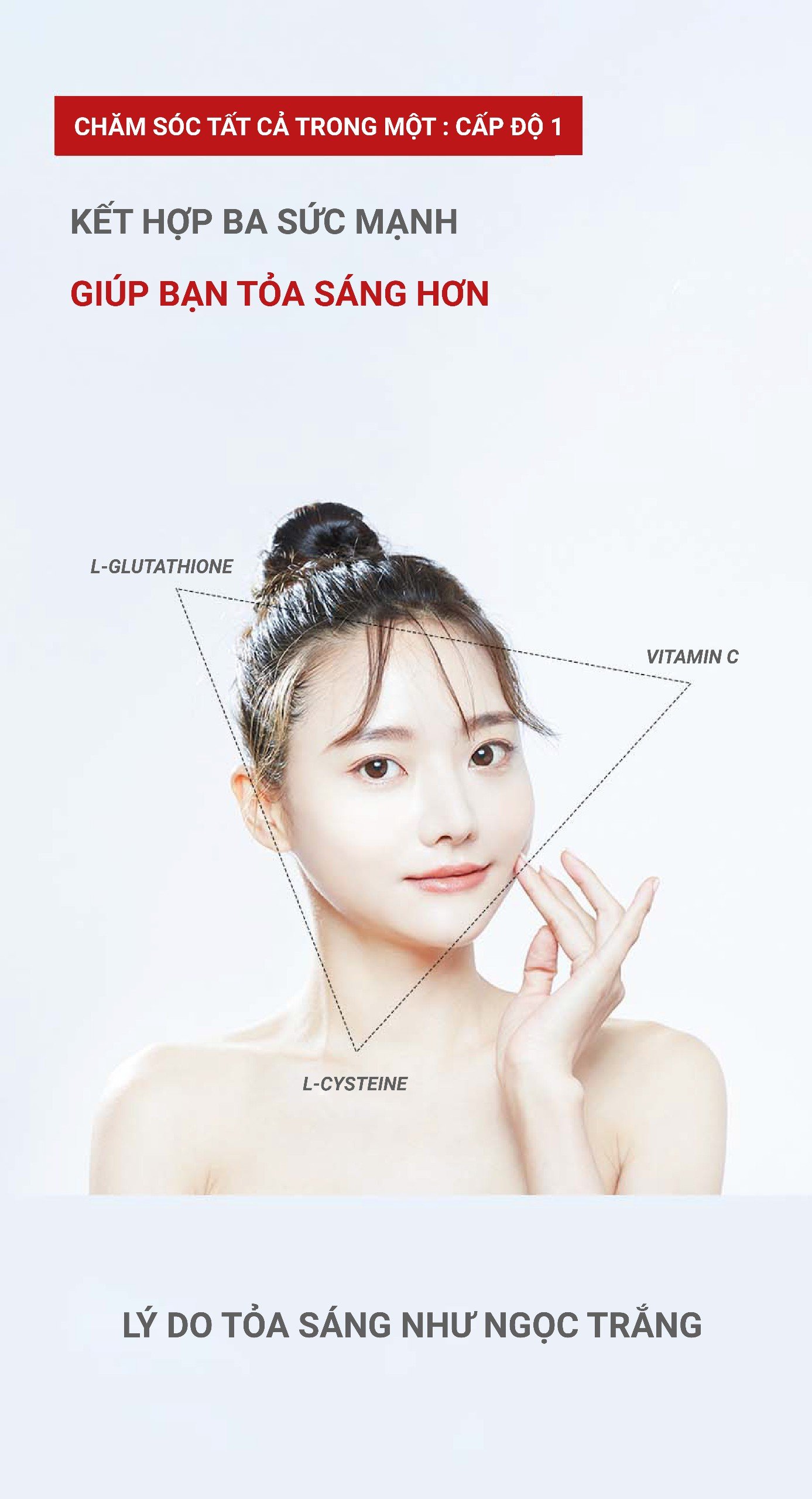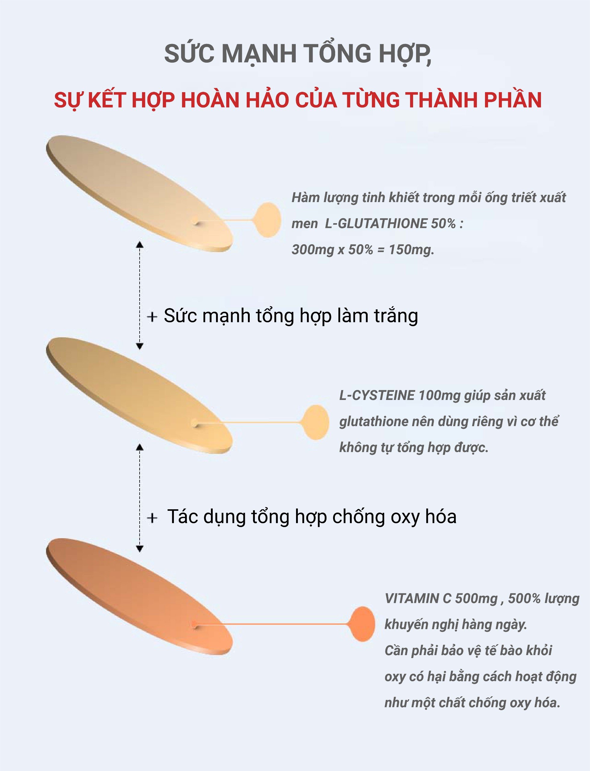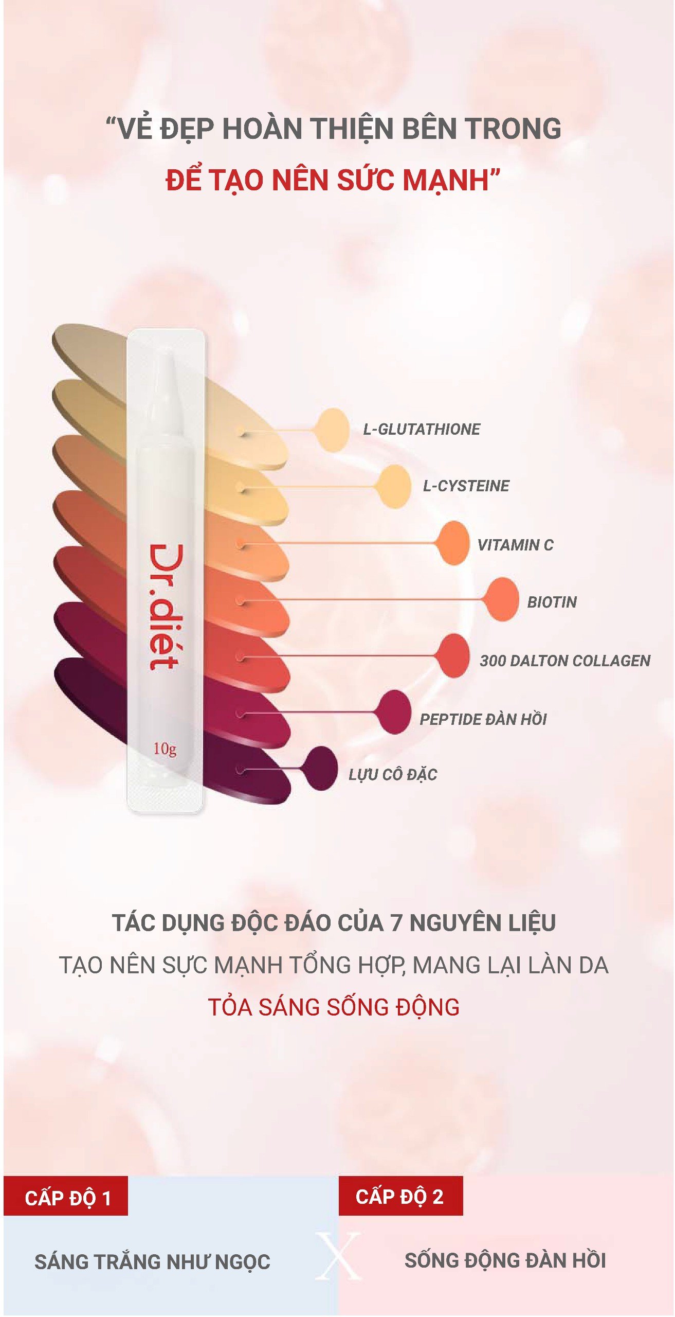 L- Glutathion, L- Cysteine, Vitamin C, Biotin, 300 Dalton collagen, Peptide đàn hồi, Tinh chất lựu cô đặc…