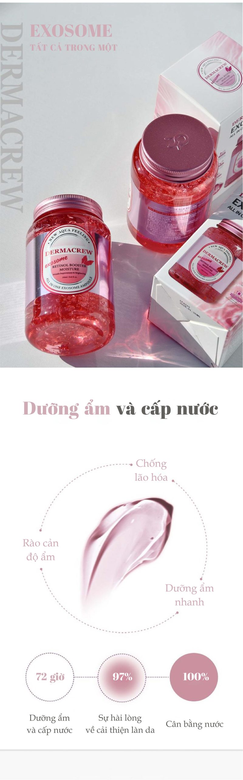 Tất cả trong một sản phẩm Exosome Retinol Bosster Moisture. Giúp cho làn da khô ráp, mệt mỏi trở nên mềm ẩm, tươi sáng tràn đầy sức sống. Với tinh chất từ niacinamide, exosome, retinol cùng các vitamil thành phần phức hợp sự hài lòng của khách hàng lên đến 97%. Dưỡng ẩm và cấp nước suốt 72h .