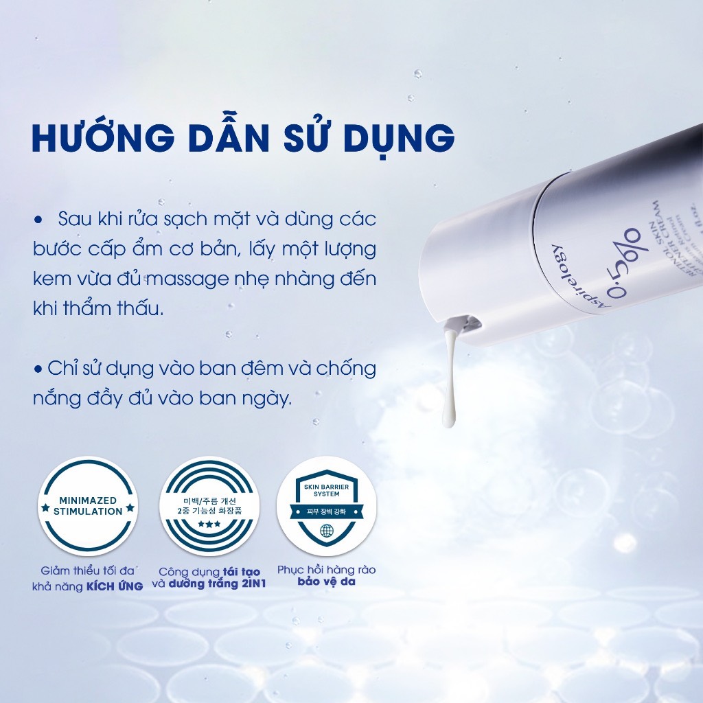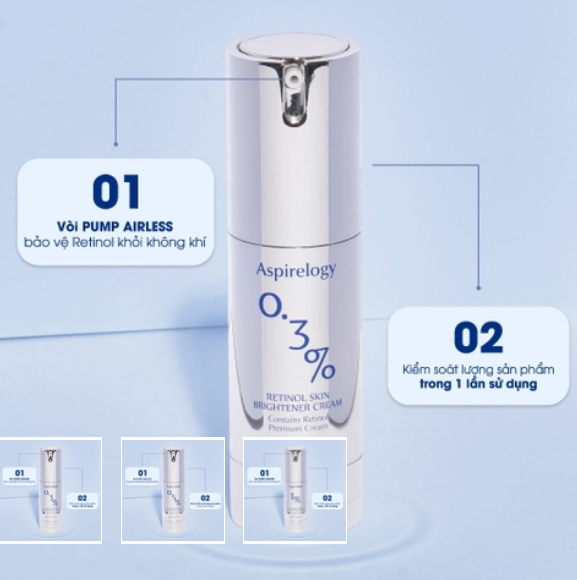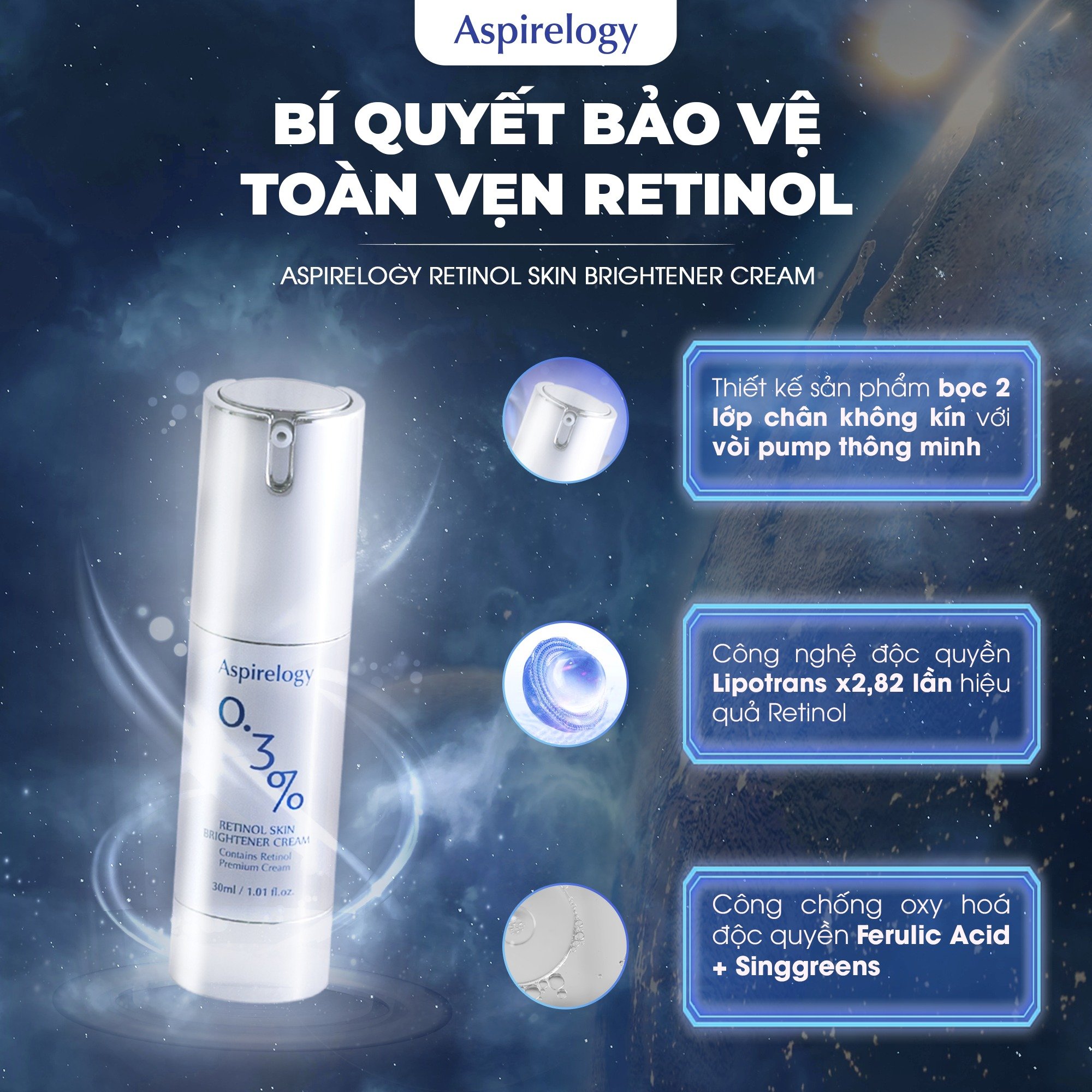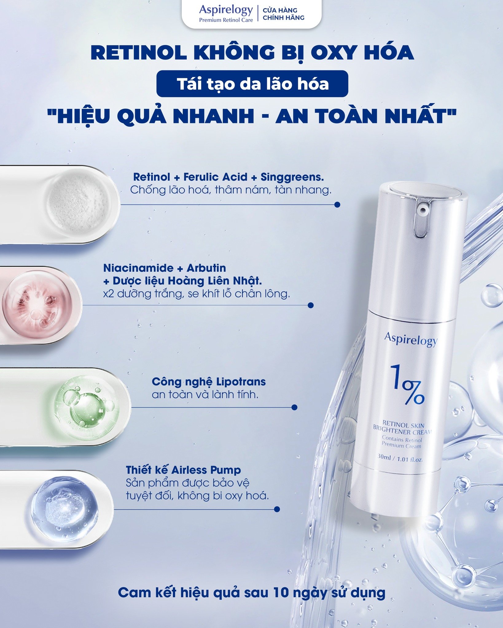 Kem Retinol 1.0% dưỡng trắng và cải thiện cấu trúc da Aspirelogy là sản phẩm đột phá mới, từ công nghệ dưỡng chất tiên tiến bên trong đến thiết kế hiện đại bên ngoài. Sở hữu công thức độc quyền 1.0% Lipotrans Retinol (công nghệ bọc thông minh giúp Retinol có thể tiếp cận và hoạt động ở nhiều tầng da) + 0.5% Ferulic Acid + 0.4% Singgreens hạn chế tối đa tình trạng oxy hóa của Retinol cả từ trước, trong và sau khi thẩm thấu vào da nhờ hạn chế khả năng bị oxy hóa của sản phẩm. Từ đó, bảo toàn công dụng của Retinol và đẩy nhanh quá trình thay da sinh học, hạn chế sự oxy hóa, tăng cường trao đổi chất để thúc đẩy sự sản sinh collagen, thay mới tế bào, cải thiện cấu trúc da, hỗ trợ giảm nếp nhăn, ức chế quá trình lão hóa, dưỡng da trắng sáng..