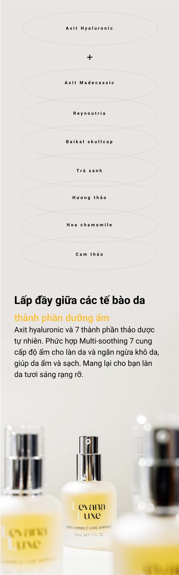 Axit Hyaluronic, Axit Madecassic, Reynoutria, Baikal skullcap, Trà xanh, Hương thảo, Hoa chamomile, Cam thảo…