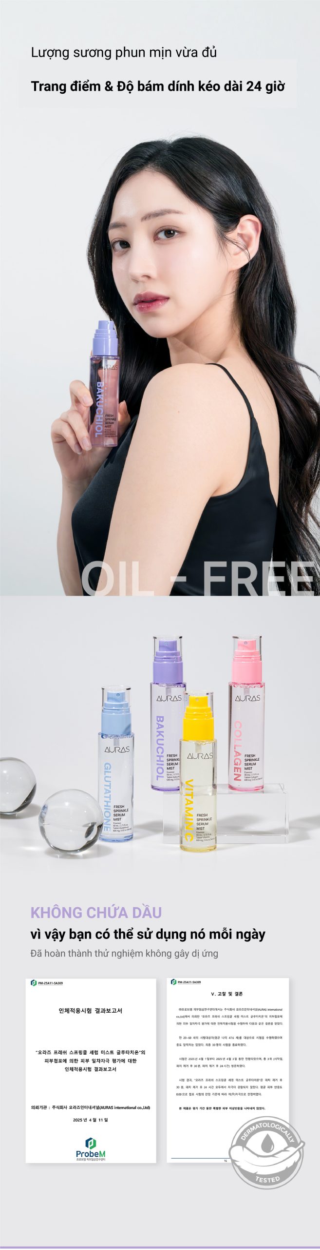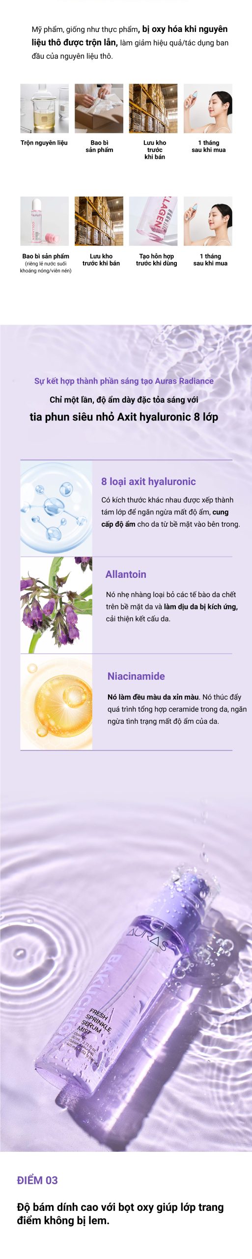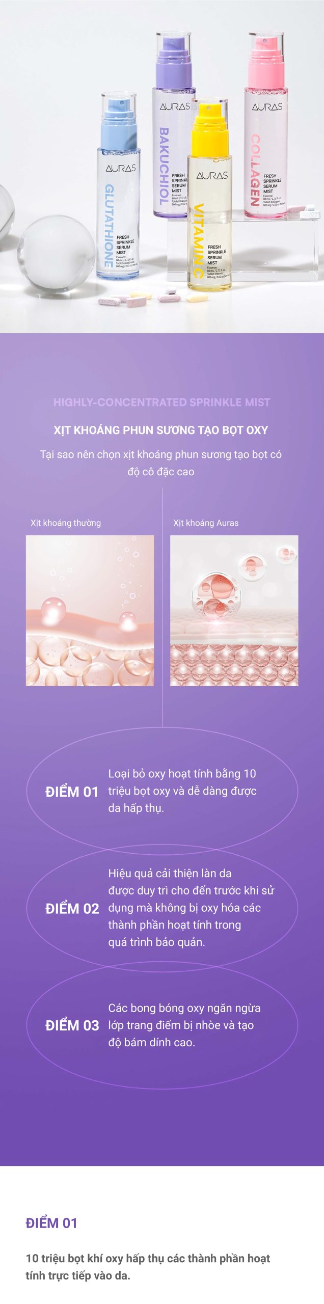 Xịt khoáng AURAS Fresh Sprinkle Serum Mist tạo ra 10 triệu bong bóng oxy giúp làm dịu da tức thì, loại bỏ các gốc tự do hàng ngày. Được cấp bằng sáng chế và kiểm nghiệm hiệu quả đáng kinh ngạc ngay từ lần xịt đầu tiên. Thành phần độc đáo từ nước suối khoáng nóng + viên nén nồng độ cao tác dụng dưỡng ẩm, làm mát, giữ lớp nền trang điểm bám dính mà không gây bí da.