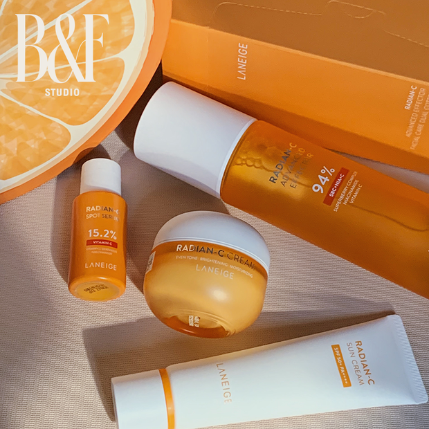 Hè này, Laneige cũng tung ra bộ sản phẩm skincare thuộc dòng Radian-C tập trung dưỡng sáng da đấy bạn biết chưa.Vốn u mê sắc cam rực rỡ, ngay từ giây phút đầu tiên cầm trên tay bộ sản phẩm này mình đã thấy rạo rực không khí hè nhiệt đới Việt Nam. Bộ này gồm 4 món: toner, serum, kem dưỡng, kem chống nắng – đủ combo skincare cơ bản cho mọi người.