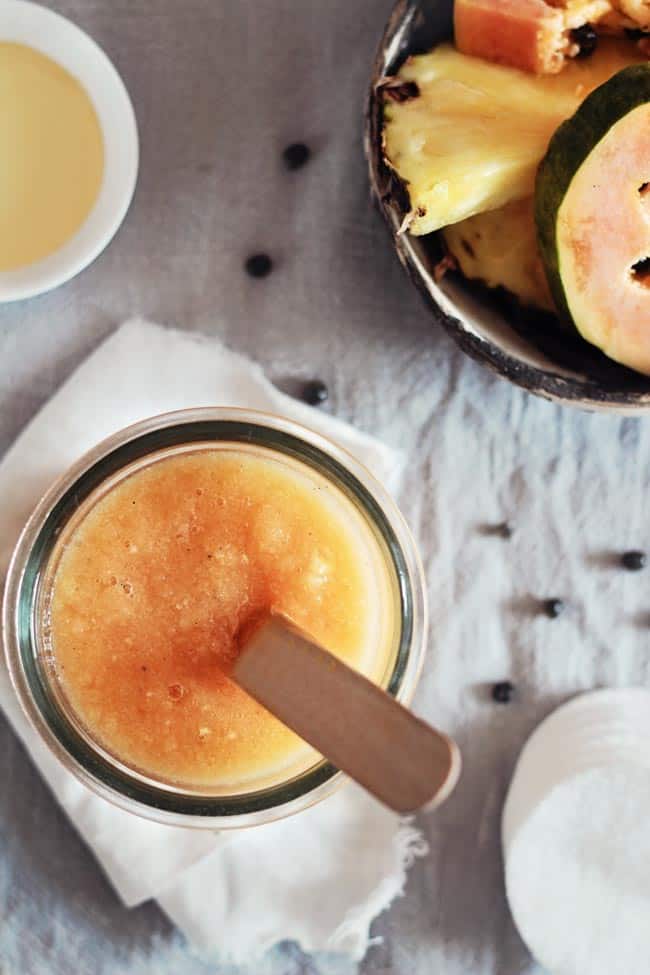 Khi được sử dụng cùng nhau, các enzym và AHA trong đu đủ và dứa có tác dụng tẩy tế bào chết và làm sáng màu da một cách tự nhiên.