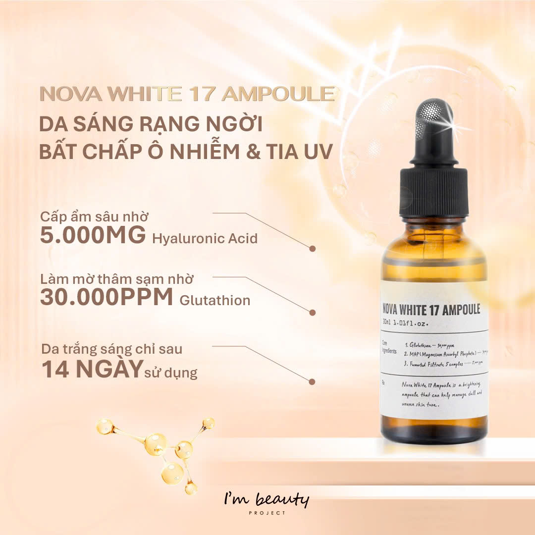 Nova White 17 Ampoule có hàm lượng chất dưỡng trắng lên tới 97%, cùng với Vitamin C, Glutathione, Tranexamic acid, bảng thành phần còn có thêm một “dưỡng chất vàng trong làng skincare”, đó là Niacinamide (một dạng của Vitamin B3)