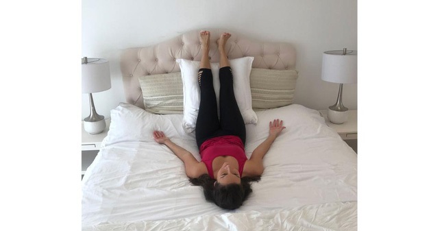 Nằm ngửa sao cho chân hướng về đầu giường. Xoay mông của bạn càng gần đầu giường càng tốt.