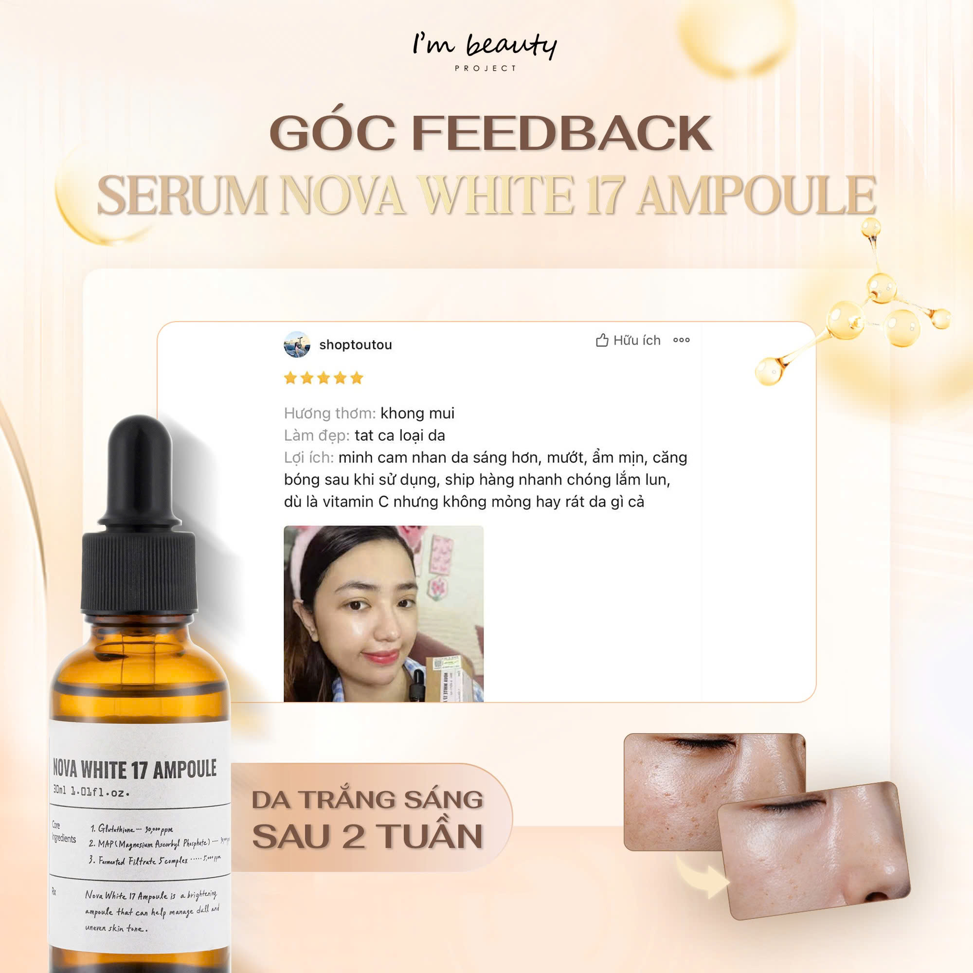 Nếu như trước đây bạn cần 4 – 5 sản phẩm khác nhau để trị nám, dưỡng trắng, dưỡng ẩm và chống lão hóa, thì giờ đây Nova White 17 Ampoule giúp rút ngắn mọi bước. Sản phẩm không chỉ tiết kiệm thời gian mà còn tối ưu hiệu quả, nhờ công thức đậm đặc gấp nhiều lần serum thông thường, đặc biệt không chứa nước, mà dùng Hắc mai biển (45.62%) làm dung môi chính, mang lại độ tinh khiết và thẩm thấu vượt trội.