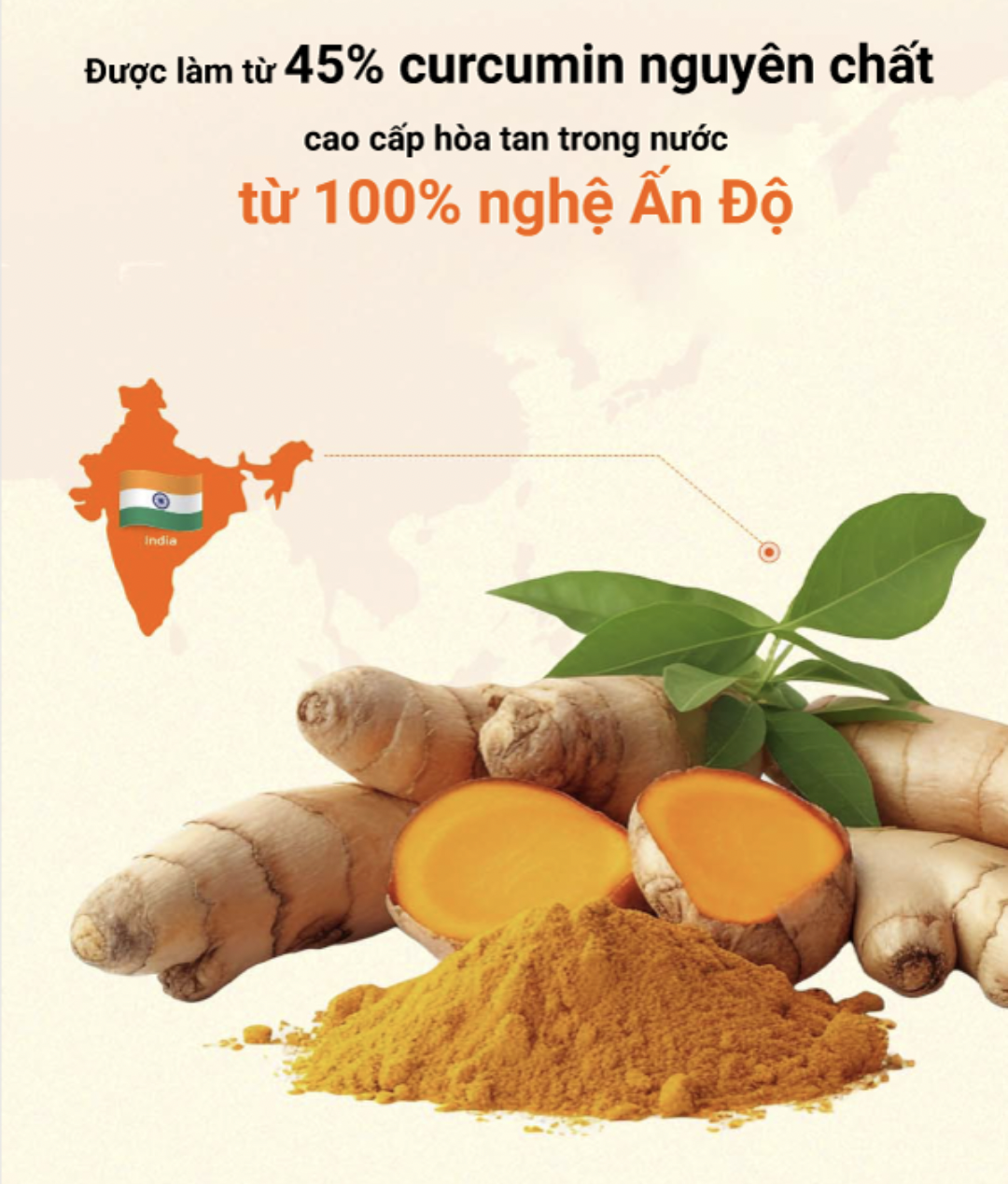 Sở dĩ củ nghệ sở hữu nhiều công dụng kỳ diệu như vậy là nhờ thành phần hoạt chất Curcumin – một “chiến binh” chống oxy hóa và kháng viêm mạnh mẽ ẩn chứa bên trong. Tuy nhiên, một thách thức lớn nhất của nghệ truyền thống chính là khả năng hấp thụ cực kém vào cơ thể do kích thước phân tử lớn và tính khó tan trong nước, khiến những giá trị tinh túy nhất thường bị đào thải trước khi kịp phát huy tác dụng.